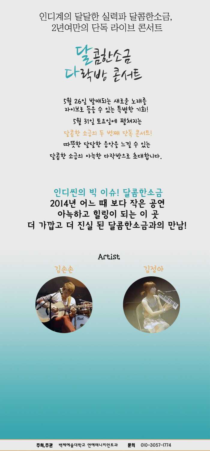 2014.05.31 달콤한 소금 다락방 콘서트 페이지 정보 조회 9,212회 작성일 14-05-31 본문 2014.05.31 달콤한 소금 다락방 콘서트 목록 이전글 2013.11.16 어쿠스틱 블렌딩 콘서트 다음글2014.11.22 조문근 밴드 콘서트 짠해!