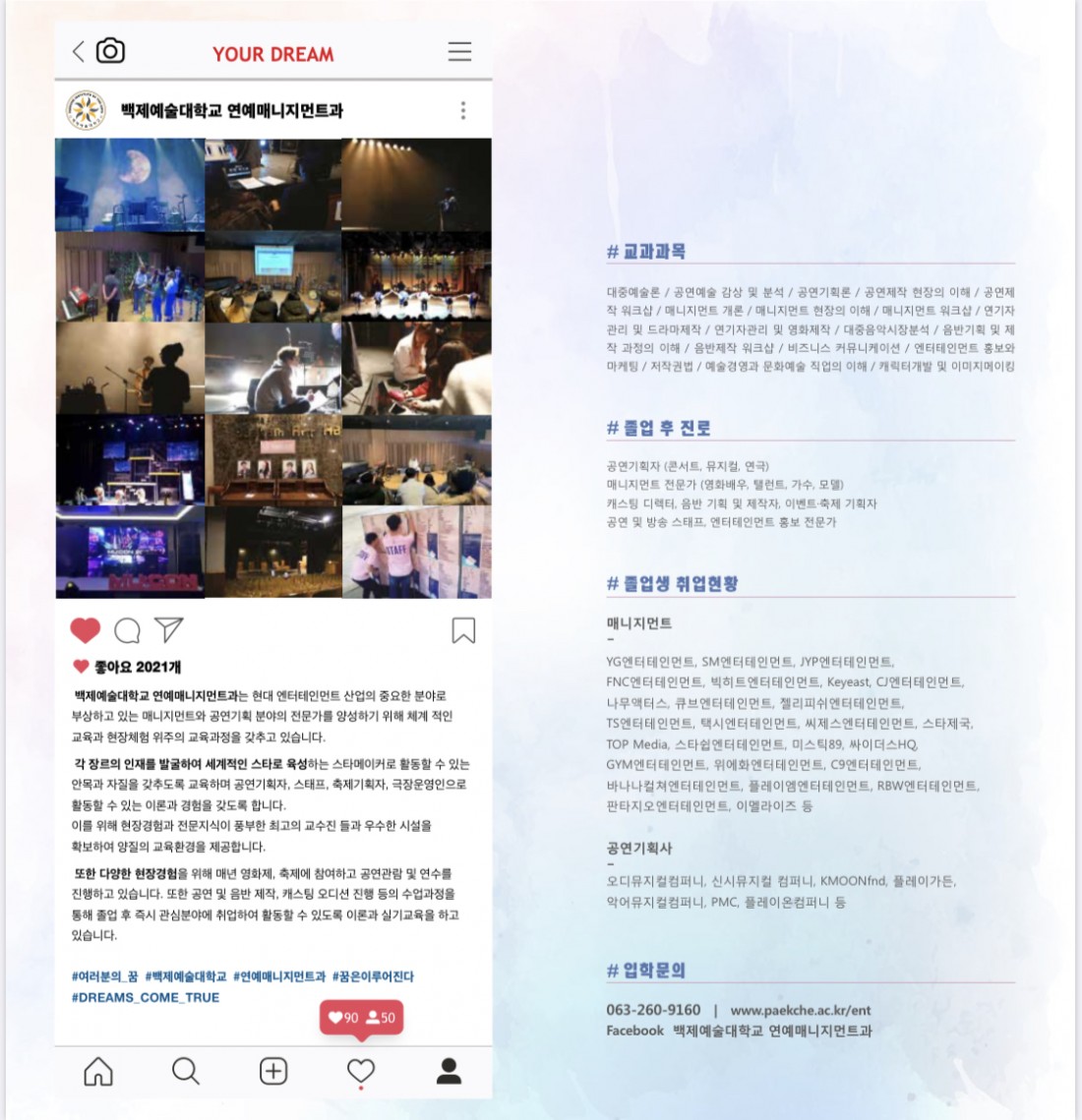 2021 연예매니지먼트과 홍보물 페이지 정보 조회 4,453회 작성일 20-08-28 본문 2021 연예매니지먼트과 홍보물 목록 이전글 2021 백제예대 연매과, 미디어음악과 합동 Project : Music & Message 'M&M' Showcase 다음글[드림캐쳐 오디션] 2020.08.08 SOURCE MUSIC AUDITION