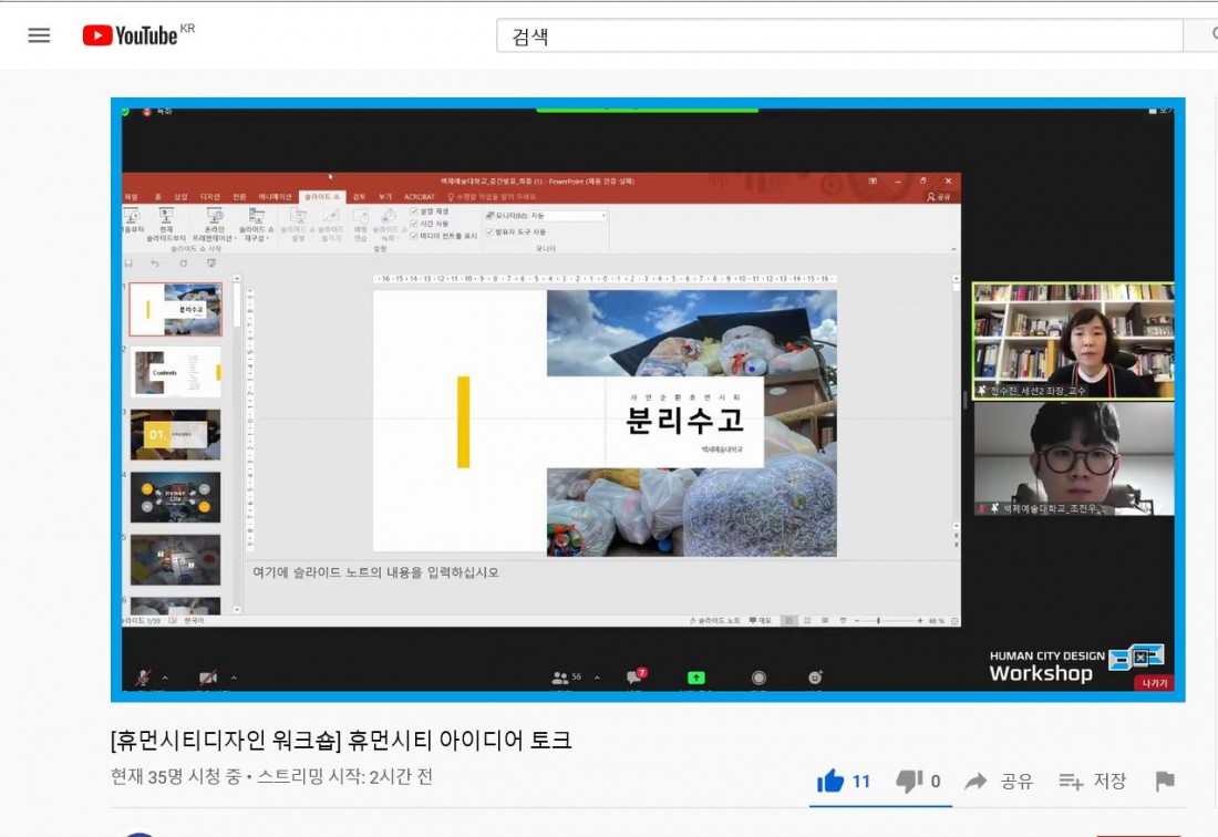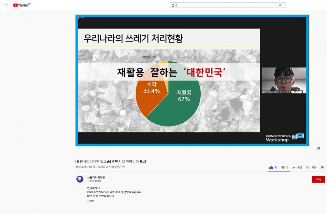 2020년 11월 14일(토) 휴먼시티대학생디자인워크숍에서 한류예술과 대표로 조진우학생이 발표하다. 주제는 <분리수고>이다.